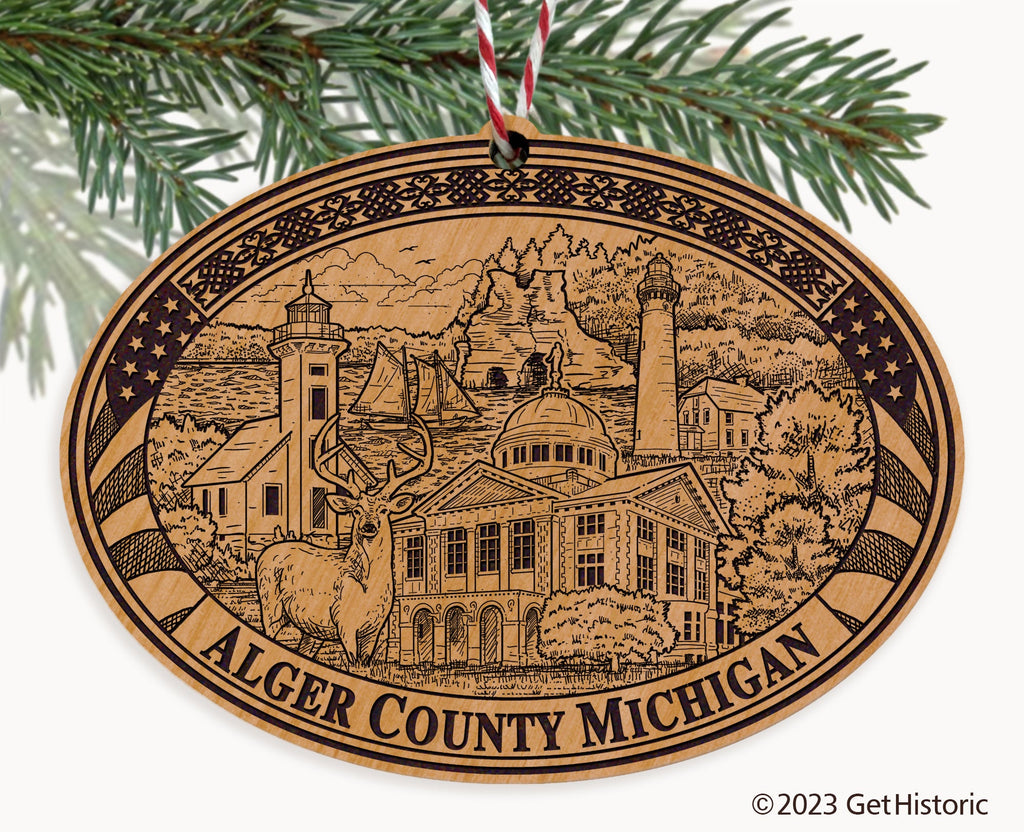 Celebrate the history of Alger County with our exclusive Natural Wood Engraved Ornament. One side will feature unique artwork telling the story of your county's history. The other side features a FREE personalization to create a cherished keepsake. If you choose not to personalize, our Get Historic logo and scrollwork will be engraved.