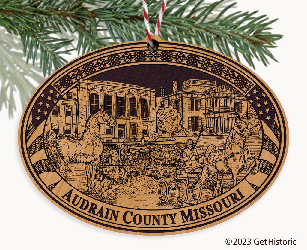 Celebrate the history of Audrain County Missouri with our exclusive Natural Wood Engraved Ornament. One side will feature unique artwork telling the story of your county's history. The other side features a FREE personalization to create a cherished keepsake. If you choose not to personalize, our Get Historic logo and scrollwork will be engraved.