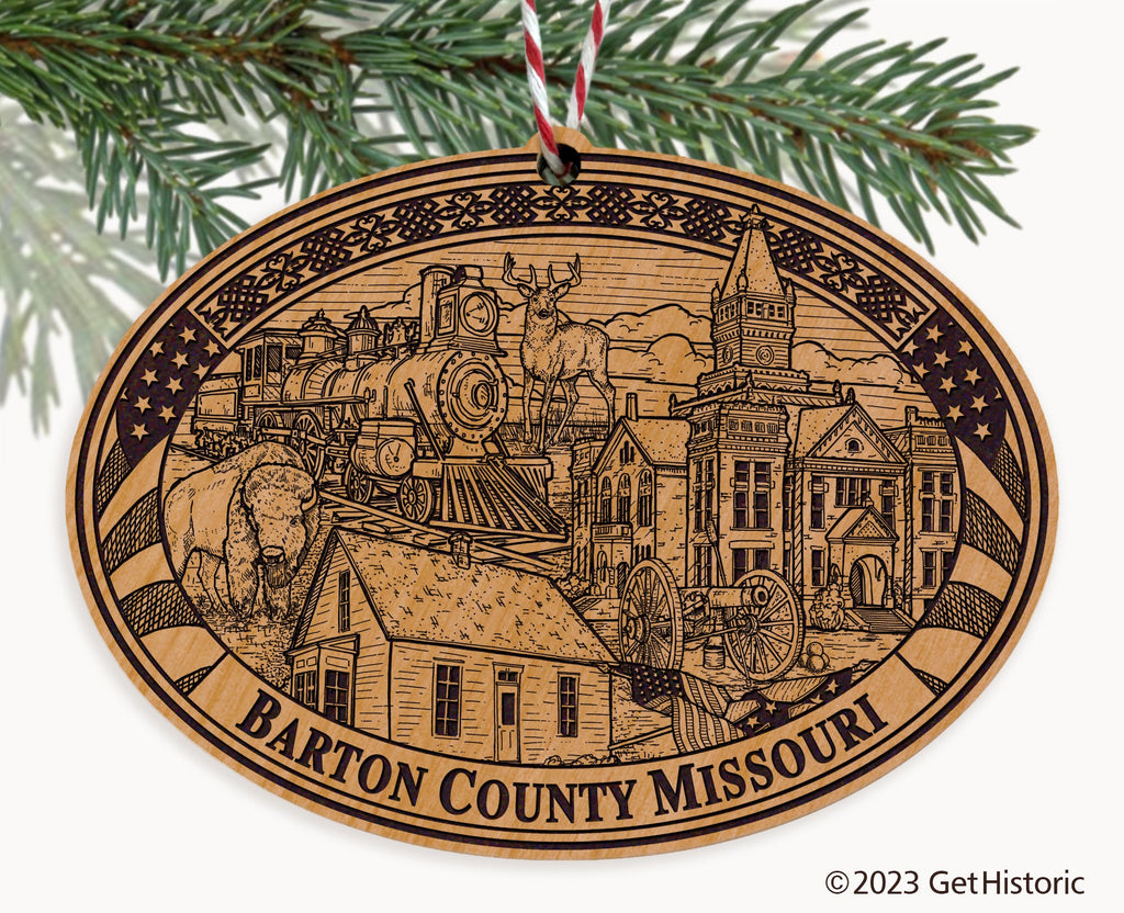 Celebrate the history of Barton County Missouri with our exclusive Natural Wood Engraved Ornament. One side will feature unique artwork telling the story of your county's history. The other side features a FREE personalization to create a cherished keepsake. If you choose not to personalize, our Get Historic logo and scrollwork will be engraved.