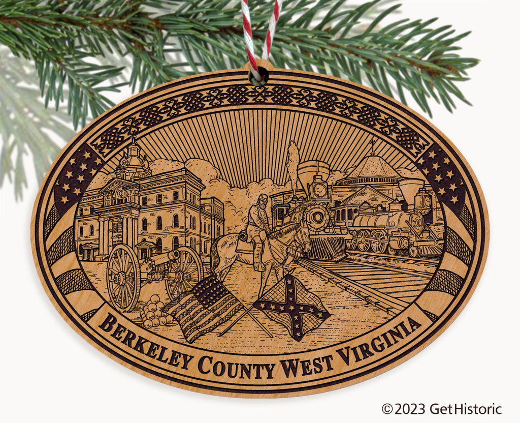 Celebrate the history of Berkeley County with our exclusive Natural Wood Engraved Ornament. One side will feature unique artwork telling the story of your county's history. The other side features a FREE personalization to create a cherished keepsake. If you choose not to personalize, our Get Historic logo and scrollwork will be engraved.