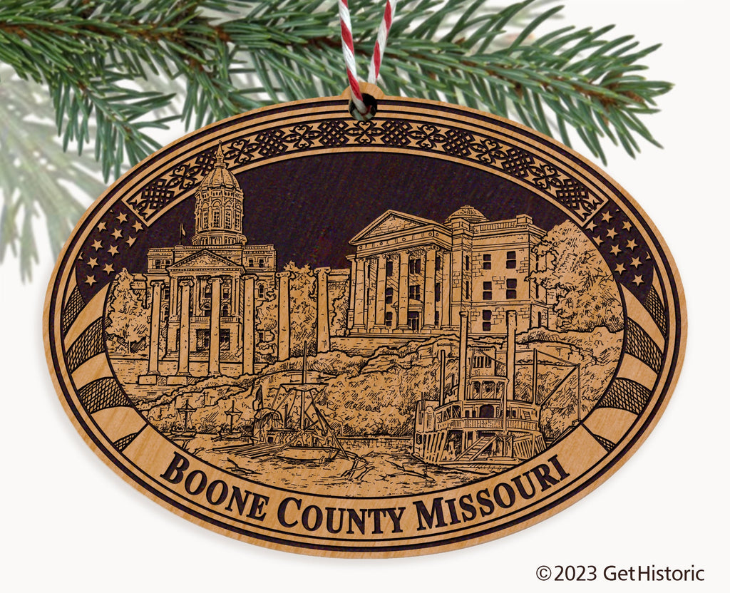 Celebrate the history of Boone County Missouri with our exclusive Natural Wood Engraved Ornament. One side will feature unique artwork telling the story of your county's history. The other side features a FREE personalization to create a cherished keepsake. If you choose not to personalize, our Get Historic logo and scrollwork will be engraved.