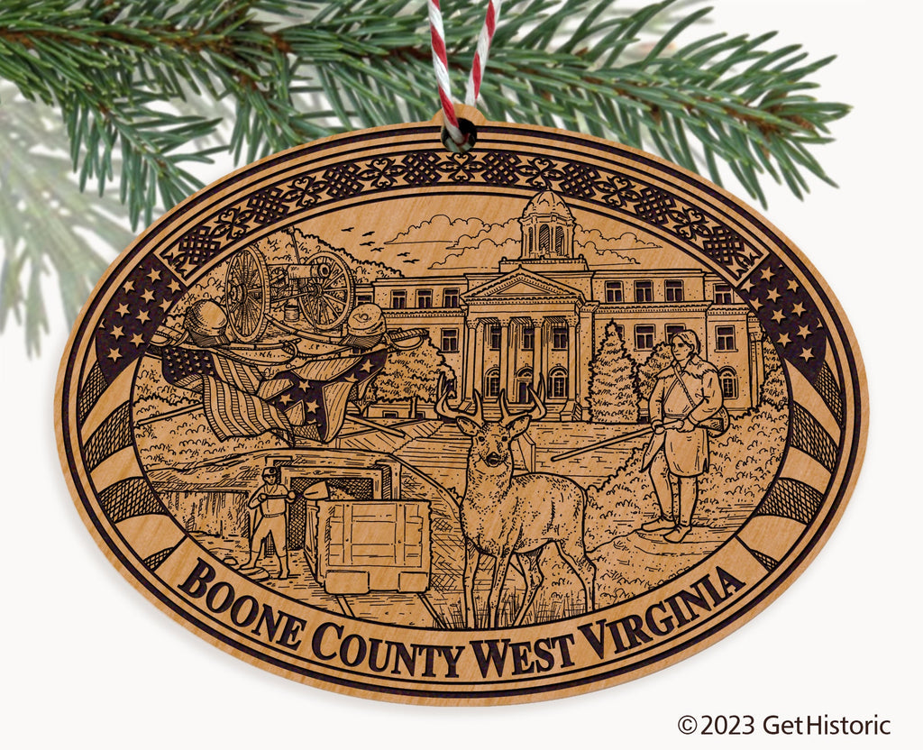 Celebrate the history of Boone County with our exclusive Natural Wood Engraved Ornament. One side will feature unique artwork telling the story of your county's history. The other side features a FREE personalization to create a cherished keepsake. If you choose not to personalize, our Get Historic logo and scrollwork will be engraved.