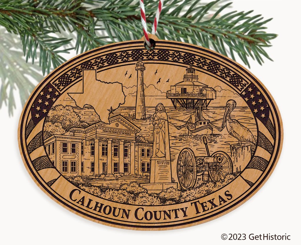 Celebrate the history of Calhoun County Texas with our exclusive Natural Wood Engraved Ornament. One side will feature unique artwork telling the story of your county's history. The other side features a FREE personalization to create a cherished keepsake. If you choose not to personalize, our Get Historic logo and scrollwork will be engraved.