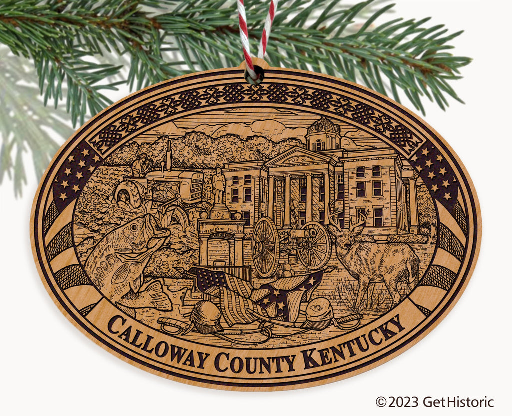 Celebrate the history of Calloway County with our exclusive Natural Wood Engraved Ornament. One side will feature unique artwork telling the story of your county's history. The other side features a FREE personalization to create a cherished keepsake. If you choose not to personalize, our Get Historic logo and scrollwork will be engraved.