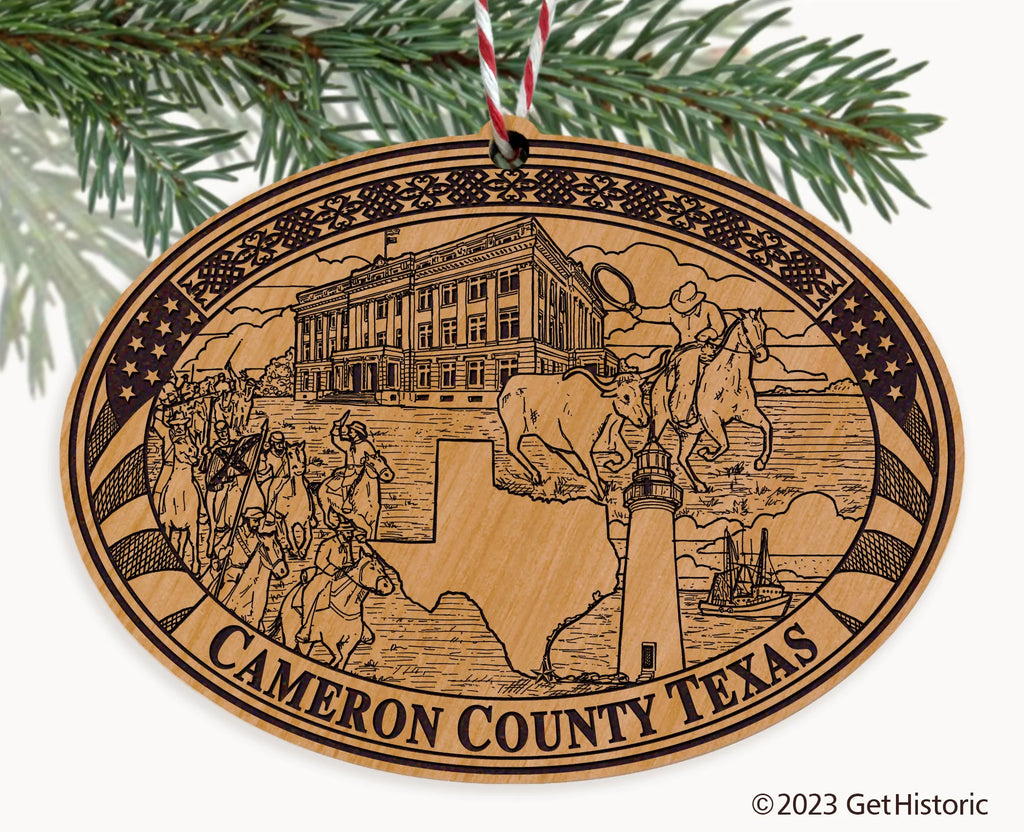 Celebrate the history of Cameron County Texas with our exclusive Natural Wood Engraved Ornament. One side will feature unique artwork telling the story of your county's history. The other side features a FREE personalization to create a cherished keepsake. If you choose not to personalize, our Get Historic logo and scrollwork will be engraved.
