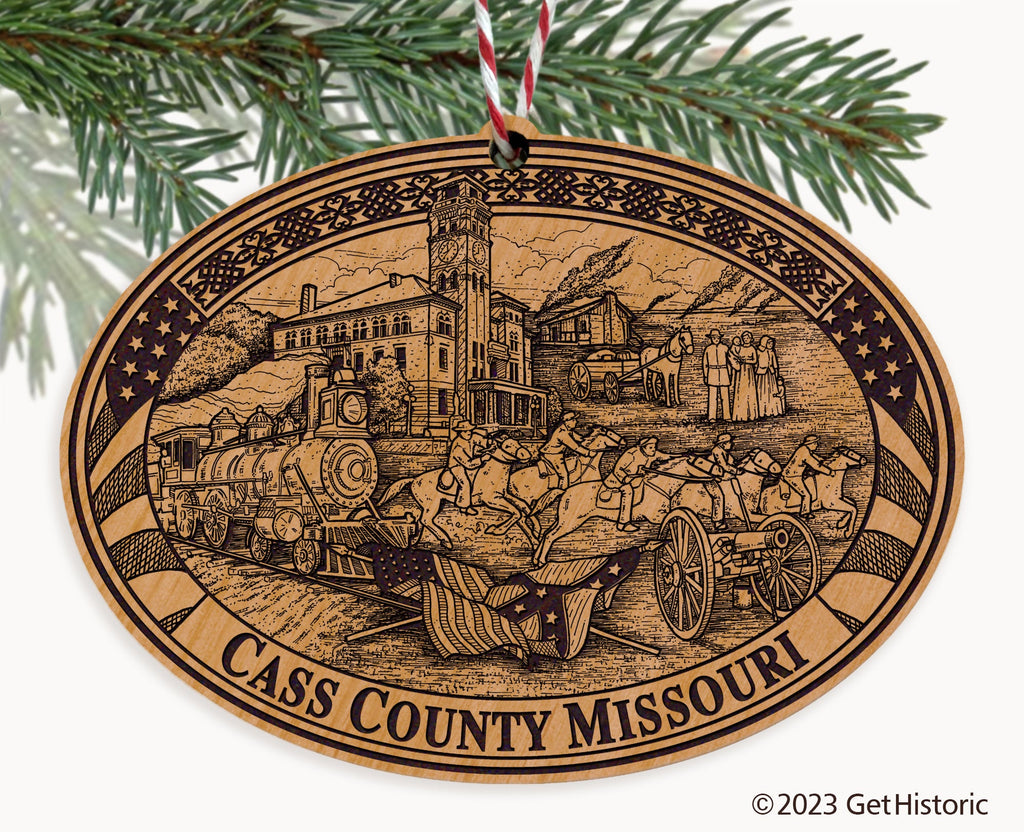 Celebrate the history of Cass County Missouri with our exclusive Natural Wood Engraved Ornament. One side will feature unique artwork telling the story of your county's history. The other side features a FREE personalization to create a cherished keepsake. If you choose not to personalize, our Get Historic logo and scrollwork will be engraved.