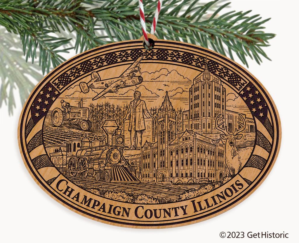 Celebrate the history of Champaign County Illinois with our exclusive Natural Wood Engraved Ornament. One side will feature unique artwork telling the story of your county's history. The other side features a FREE personalization to create a cherished keepsake. If you choose not to personalize, our Get Historic logo and scrollwork will be engraved.