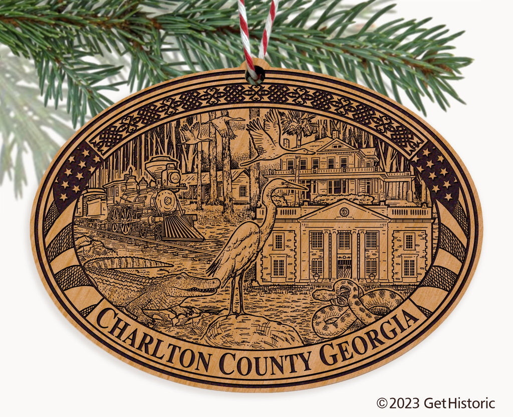 Celebrate the history of Charlton County Georgia with our exclusive Natural Wood Engraved Ornament. One side will feature unique artwork telling the story of your county's history. The other side features a FREE personalization to create a cherished keepsake. If you choose not to personalize, our Get Historic logo and scrollwork will be engraved.