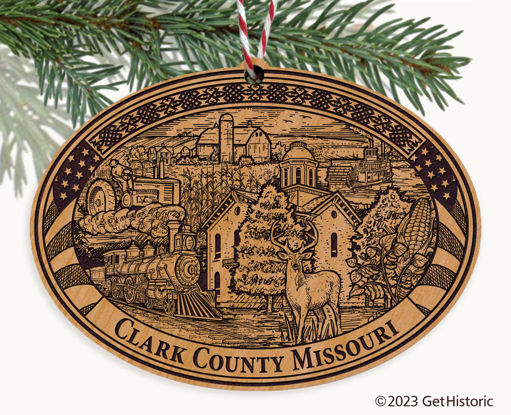 Celebrate the history of Clark County Missouri with our exclusive Natural Wood Engraved Ornament. One side will feature unique artwork telling the story of your county's history. The other side features a FREE personalization to create a cherished keepsake. If you choose not to personalize, our Get Historic logo and scrollwork will be engraved.