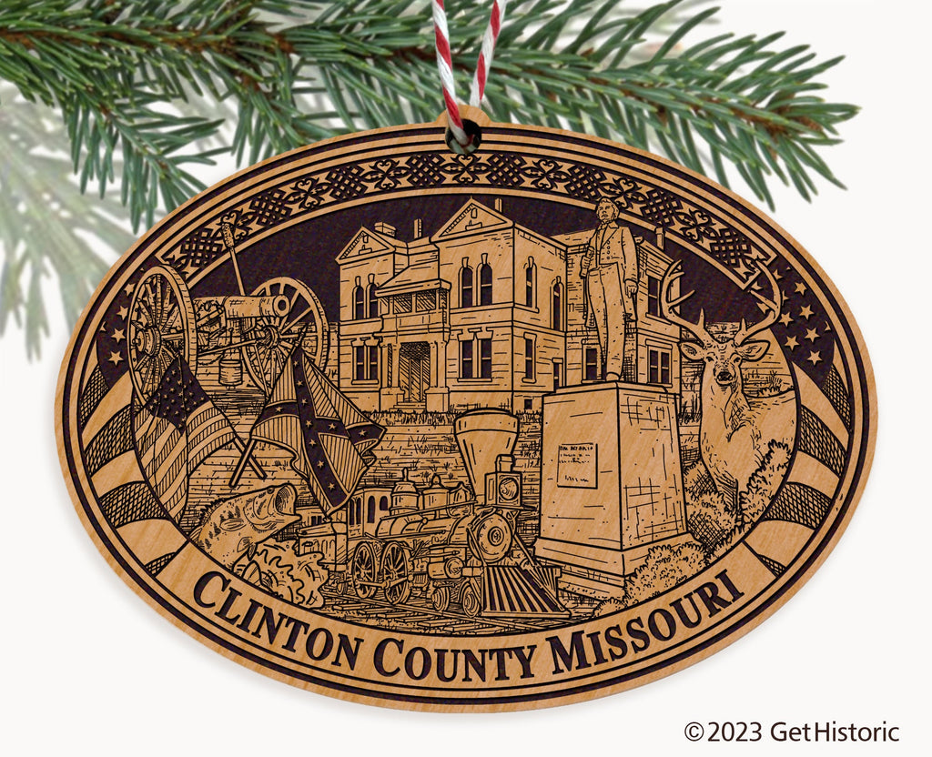 Celebrate the history of Clinton County Missouri with our exclusive Natural Wood Engraved Ornament. One side will feature unique artwork telling the story of your county's history. The other side features a FREE personalization to create a cherished keepsake. If you choose not to personalize, our Get Historic logo and scrollwork will be engraved.