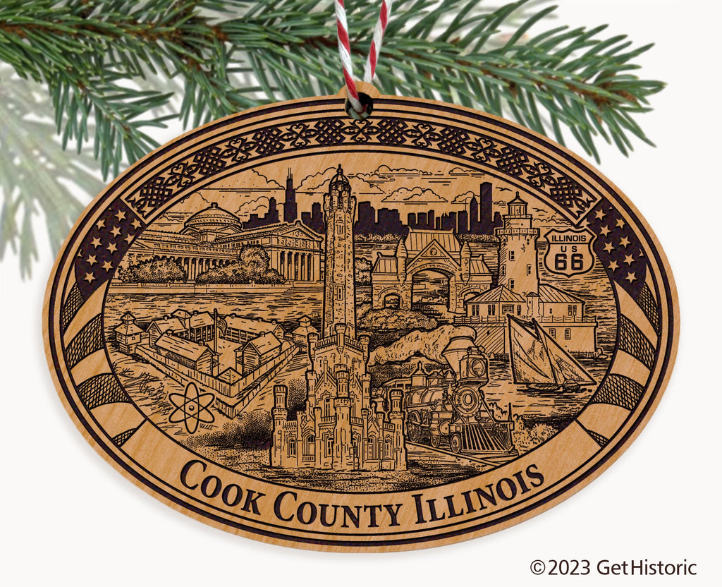 Celebrate the history of Cook County Illinois with our exclusive Natural Wood Engraved Ornament. One side will feature unique artwork telling the story of your county's history. The other side features a FREE personalization to create a cherished keepsake. If you choose not to personalize, our Get Historic logo and scrollwork will be engraved.