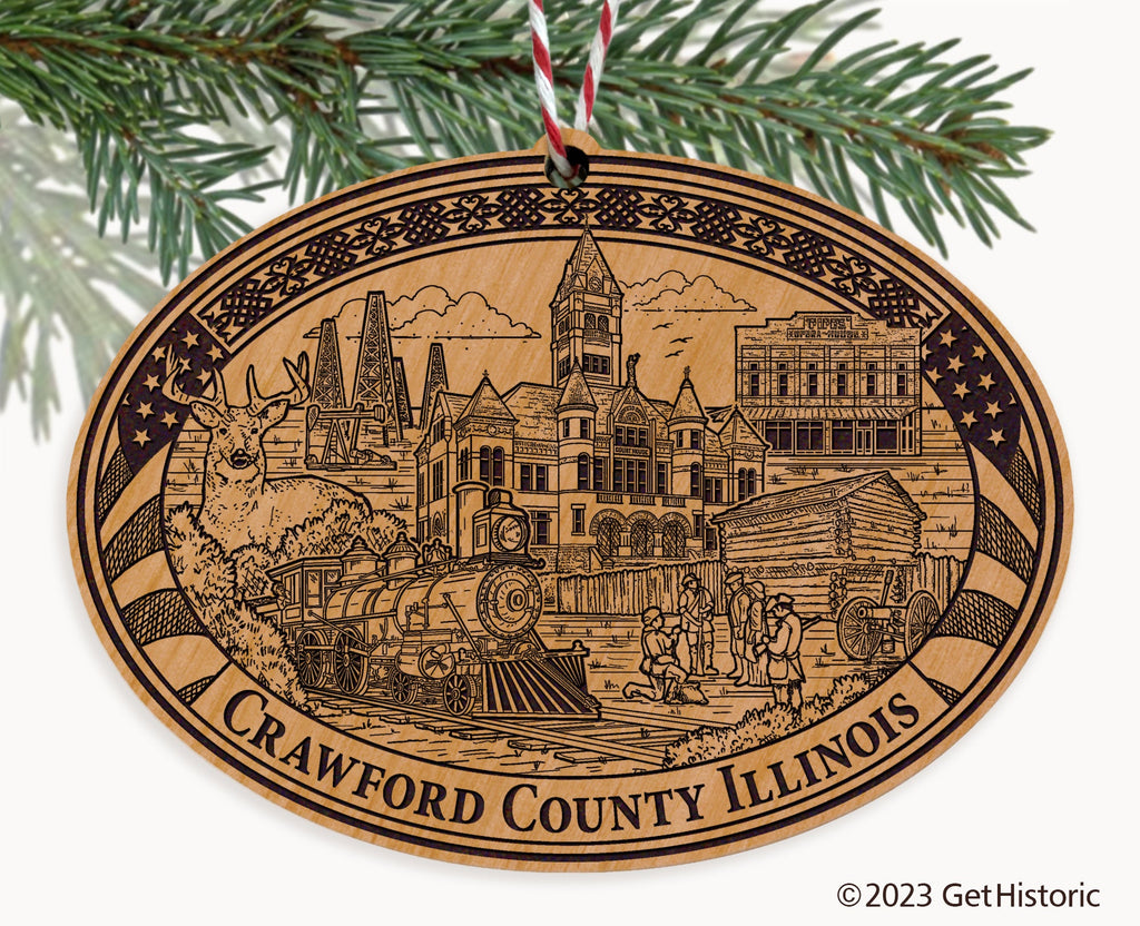 Celebrate the history of Crawford County Illinois with our exclusive Natural Wood Engraved Ornament. One side will feature unique artwork telling the story of your county's history. The other side features a FREE personalization to create a cherished keepsake. If you choose not to personalize, our Get Historic logo and scrollwork will be engraved.
