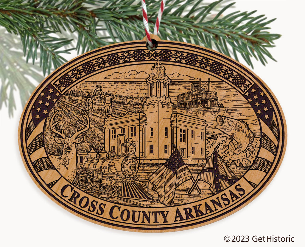 Celebrate the history of Cross County Arkansas with our exclusive Natural Wood Engraved Ornament. One side will feature unique artwork telling the story of your county's history. The other side features a FREE personalization to create a cherished keepsake. If you choose not to personalize, our Get Historic logo and scrollwork will be engraved.