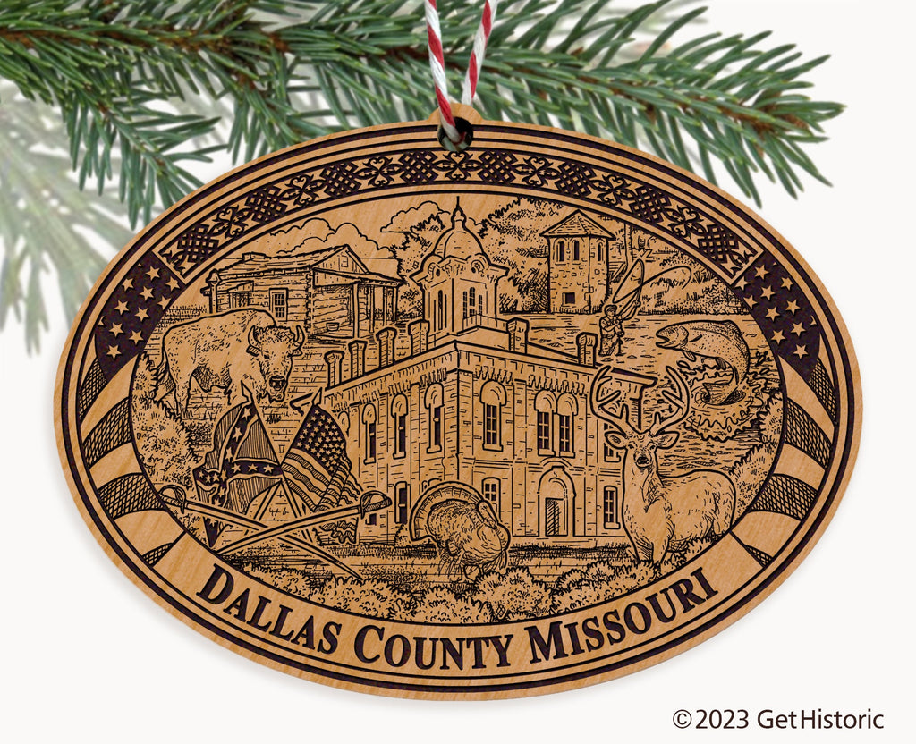 Celebrate the history of Dallas County Missouri with our exclusive Natural Wood Engraved Ornament. One side will feature unique artwork telling the story of your county's history. The other side features a FREE personalization to create a cherished keepsake. If you choose not to personalize, our Get Historic logo and scrollwork will be engraved.