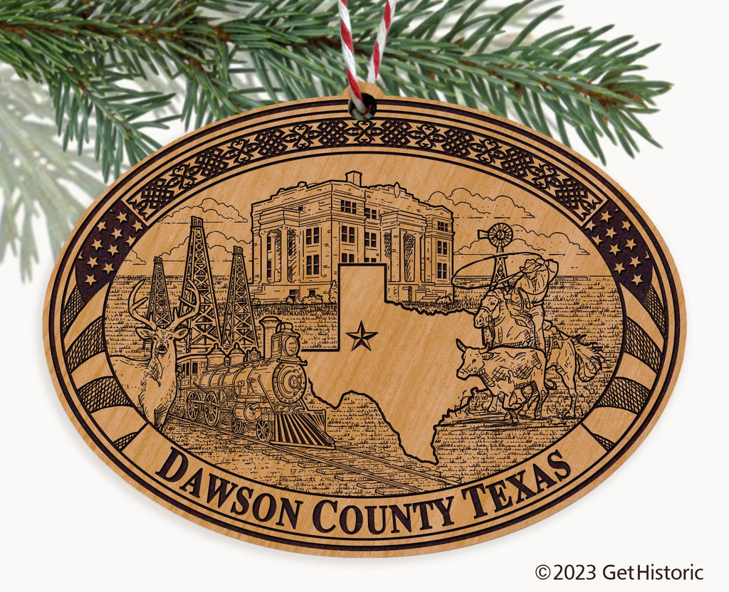 Celebrate the history of Dawson County Texas with our exclusive Natural Wood Engraved Ornament. One side will feature unique artwork telling the story of your county's history. The other side features a FREE personalization to create a cherished keepsake. If you choose not to personalize, our Get Historic logo and scrollwork will be engraved.