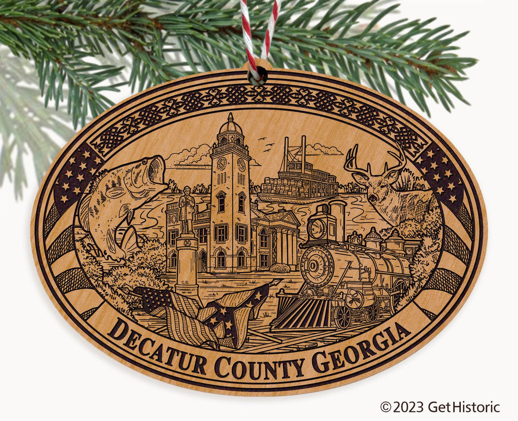 Celebrate the history of Decatur County Georgia with our exclusive Natural Wood Engraved Ornament. One side will feature unique artwork telling the story of your county's history. The other side features a FREE personalization to create a cherished keepsake. If you choose not to personalize, our Get Historic logo and scrollwork will be engraved.