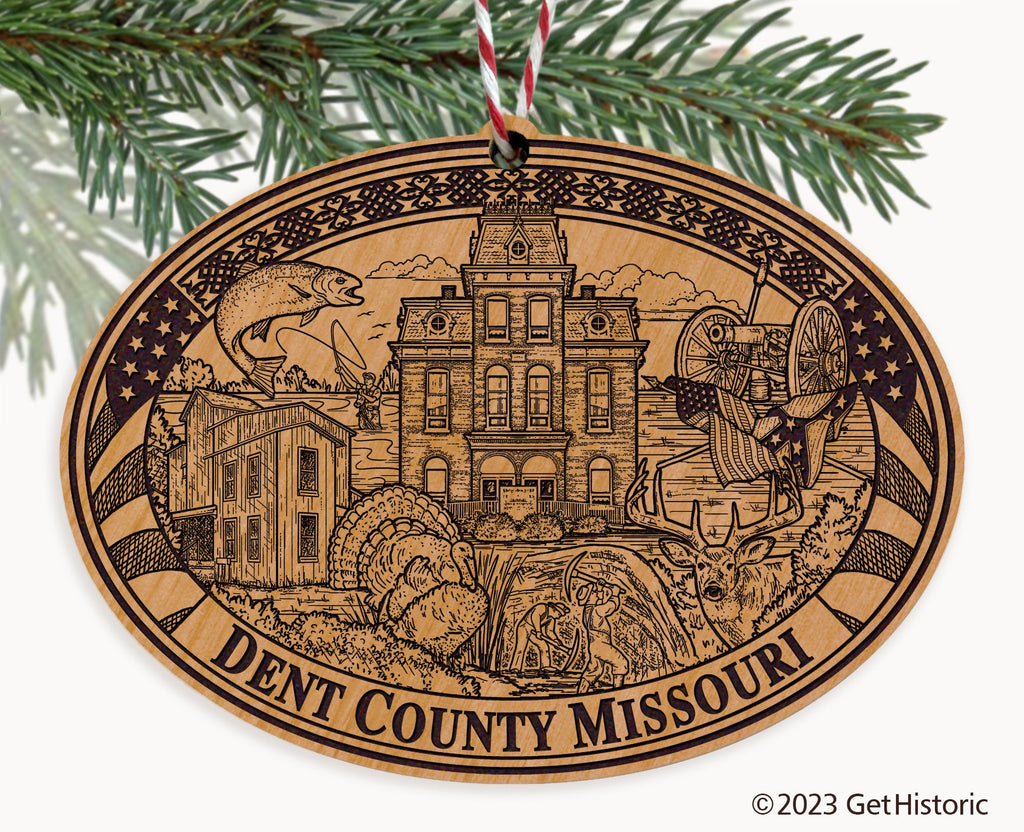Celebrate the history of Dent County Missouri with our exclusive Natural Wood Engraved Ornament. One side will feature unique artwork telling the story of your county's history. The other side features a FREE personalization to create a cherished keepsake. If you choose not to personalize, our Get Historic logo and scrollwork will be engraved.
