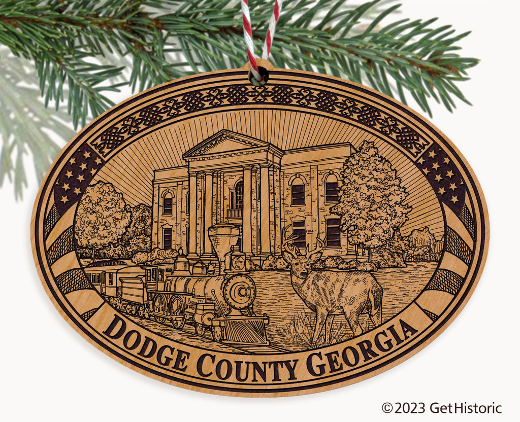 Celebrate the history of Dodge County Georgia with our exclusive Natural Wood Engraved Ornament. One side will feature unique artwork telling the story of your county's history. The other side features a FREE personalization to create a cherished keepsake. If you choose not to personalize, our Get Historic logo and scrollwork will be engraved.