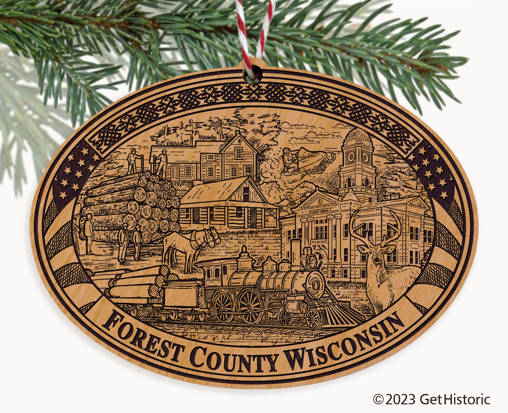 Celebrate the history of Forest County with our exclusive Natural Wood Engraved Ornament. One side will feature unique artwork telling the story of your county's history. The other side features a FREE personalization to create a cherished keepsake. If you choose not to personalize, our Get Historic logo and scrollwork will be engraved.