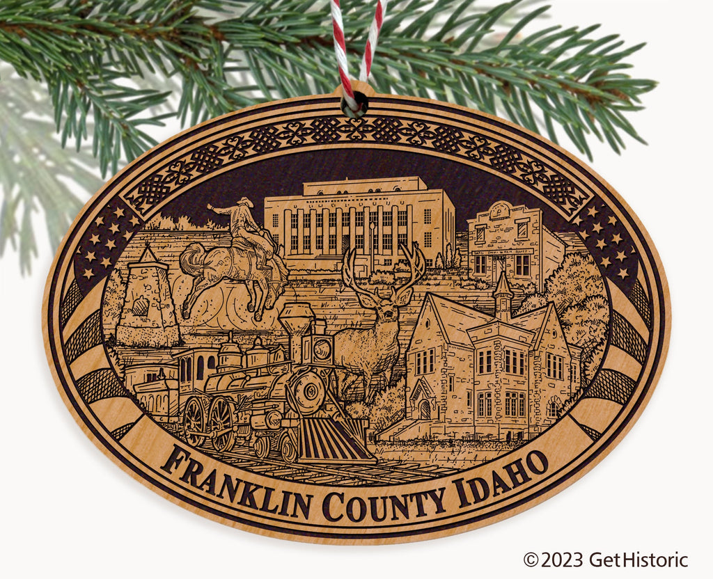 Celebrate the history of Franklin County Idaho with our exclusive Natural Wood Engraved Ornament. One side will feature unique artwork telling the story of your county's history. The other side features a FREE personalization to create a cherished keepsake. If you choose not to personalize, our Get Historic logo and scrollwork will be engraved.