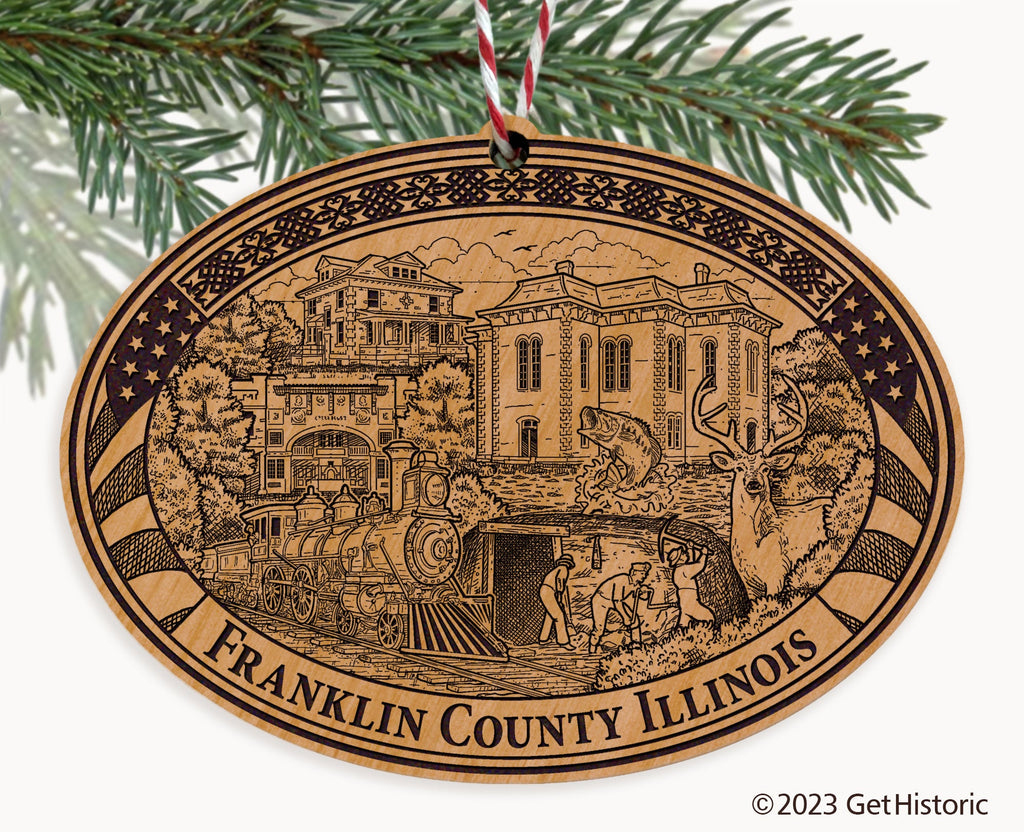 Celebrate the history of Franklin County Illinois with our exclusive Natural Wood Engraved Ornament. One side will feature unique artwork telling the story of your county's history. The other side features a FREE personalization to create a cherished keepsake. If you choose not to personalize, our Get Historic logo and scrollwork will be engraved.