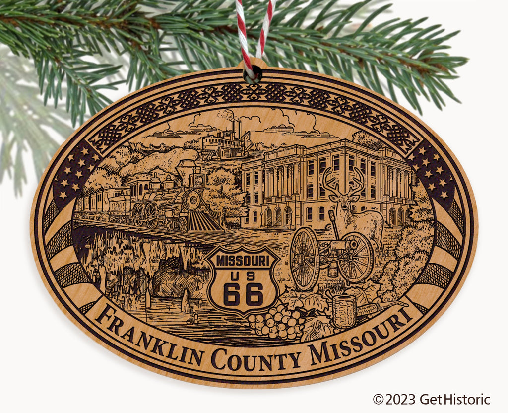 Celebrate the history of Franklin County Missouri with our exclusive Natural Wood Engraved Ornament. One side will feature unique artwork telling the story of your county's history. The other side features a FREE personalization to create a cherished keepsake. If you choose not to personalize, our Get Historic logo and scrollwork will be engraved.
