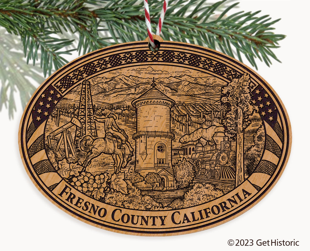 Celebrate the history of Fresno County with our exclusive Natural Wood Engraved Ornament. One side will feature unique artwork telling the story of your county's history. The other side features a FREE personalization to create a cherished keepsake. If you choose not to personalize, our Get Historic logo and scrollwork will be engraved.