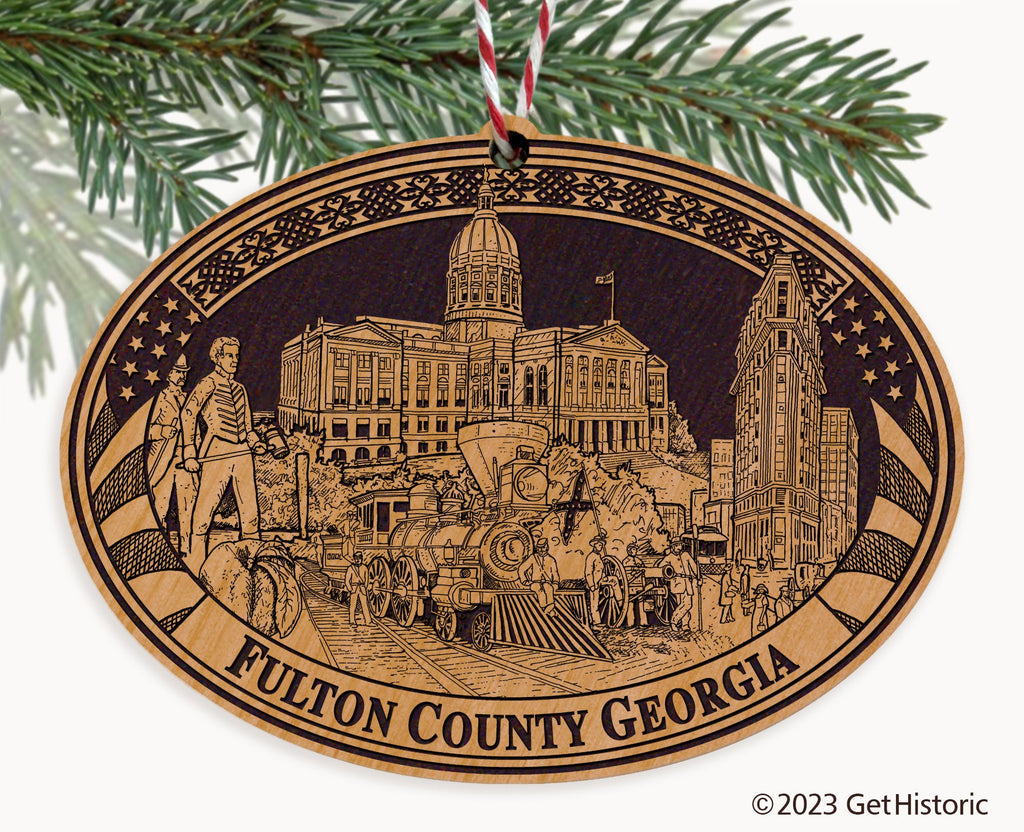 Celebrate the history of Fulton County Georgia with our exclusive Natural Wood Engraved Ornament. One side will feature unique artwork telling the story of your county's history. The other side features a FREE personalization to create a cherished keepsake. If you choose not to personalize, our Get Historic logo and scrollwork will be engraved.