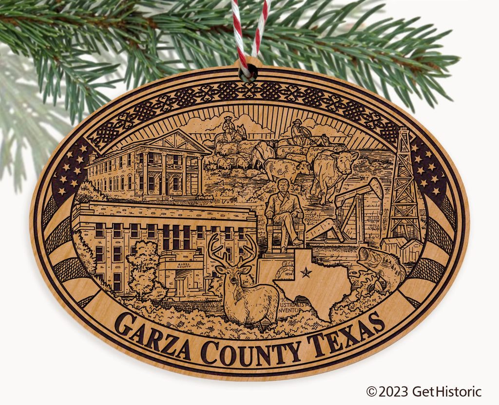 Celebrate the history of Garza County Texas with our exclusive Natural Wood Engraved Ornament. One side will feature unique artwork telling the story of your county's history. The other side features a FREE personalization to create a cherished keepsake. If you choose not to personalize, our Get Historic logo and scrollwork will be engraved.