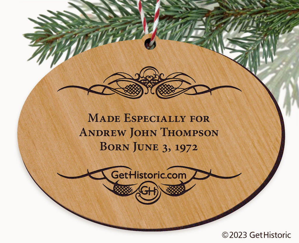 Celebrate the history of Gem County Idaho with our exclusive Natural Wood Engraved Ornament. One side will feature unique artwork telling the story of your county's history. The other side features a FREE personalization to create a cherished keepsake. If you choose not to personalize, our Get Historic logo and scrollwork will be engraved.