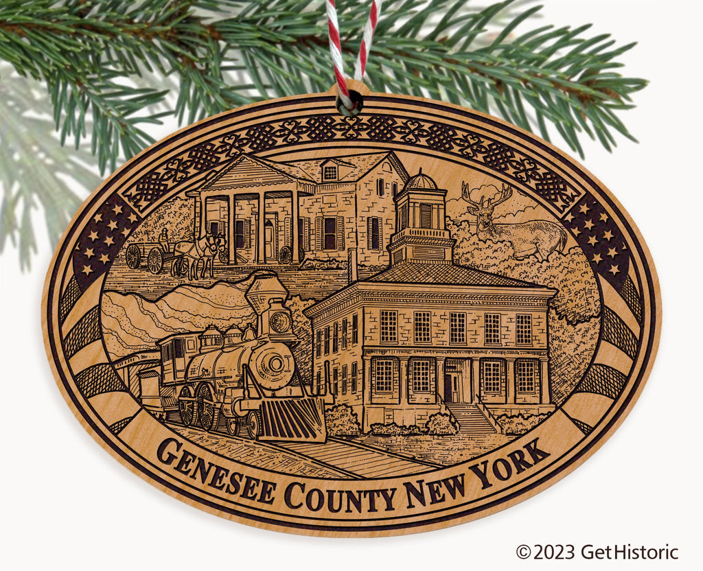 Celebrate the history of Genesee County with our exclusive Natural Wood Engraved Ornament. One side will feature unique artwork telling the story of your county's history. The other side features a FREE personalization to create a cherished keepsake. If you choose not to personalize, our Get Historic logo and scrollwork will be engraved.
