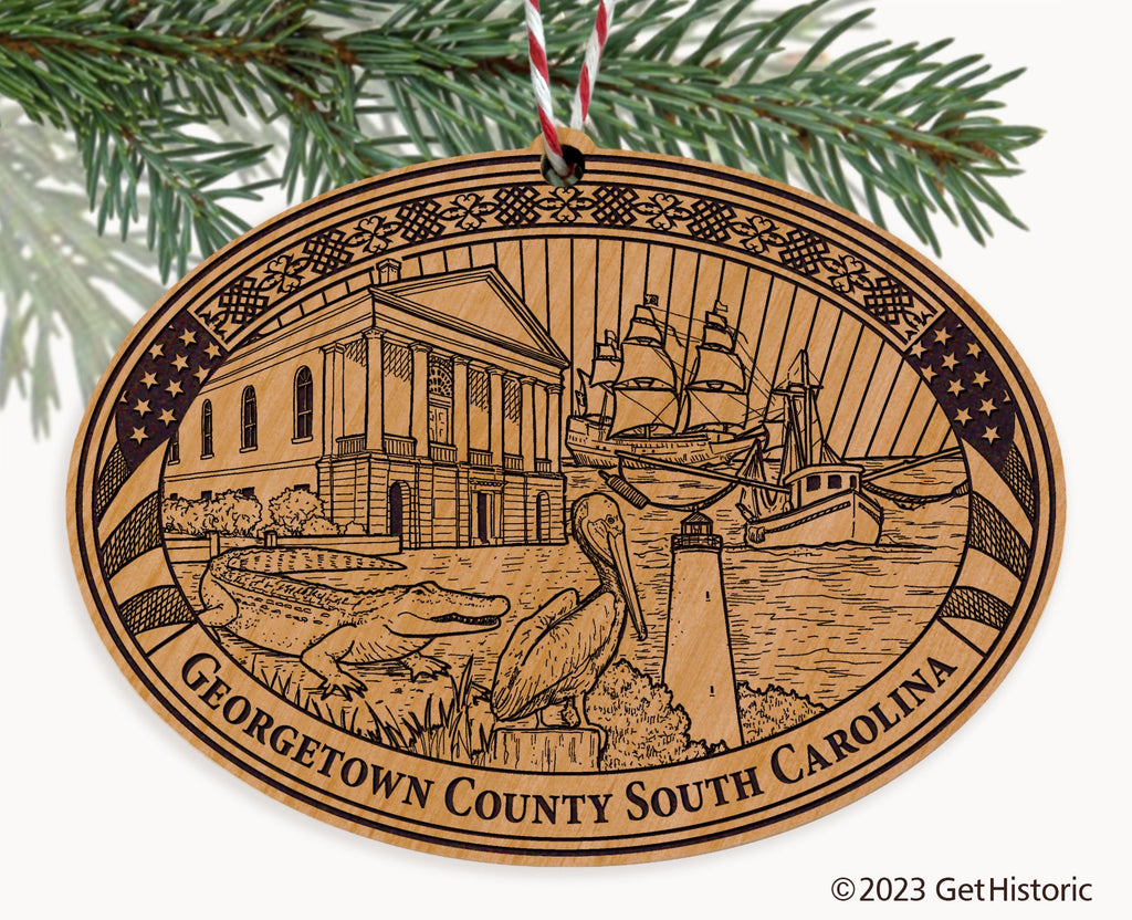 Celebrate the history of Georgetown County with our exclusive Natural Wood Engraved Ornament. One side will feature unique artwork telling the story of your county's history. The other side features a FREE personalization to create a cherished keepsake. If you choose not to personalize, our Get Historic logo and scrollwork will be engraved.