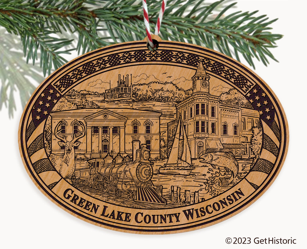 Celebrate the history of Green Lake County with our exclusive Natural Wood Engraved Ornament. One side will feature unique artwork telling the story of your county's history. The other side features a FREE personalization to create a cherished keepsake. If you choose not to personalize, our Get Historic logo and scrollwork will be engraved.