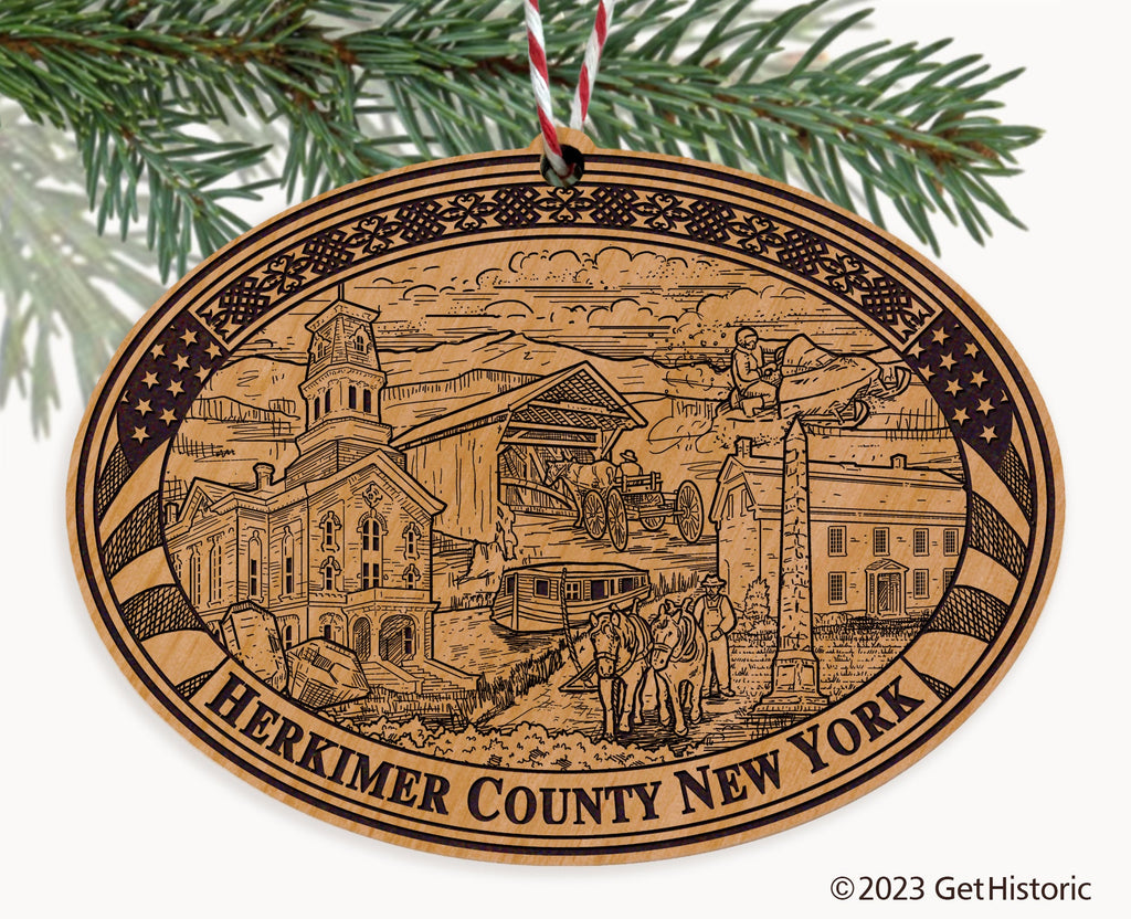 Celebrate the history of Herkimer County with our exclusive Natural Wood Engraved Ornament. One side will feature unique artwork telling the story of your county's history. The other side features a FREE personalization to create a cherished keepsake. If you choose not to personalize, our Get Historic logo and scrollwork will be engraved.