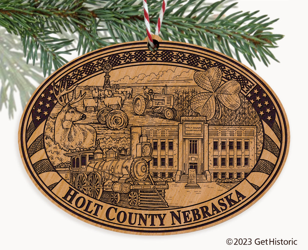 Celebrate the history of Holt County with our exclusive Natural Wood Engraved Ornament. One side will feature unique artwork telling the story of your county's history. The other side features a FREE personalization to create a cherished keepsake. If you choose not to personalize, our Get Historic logo and scrollwork will be engraved.