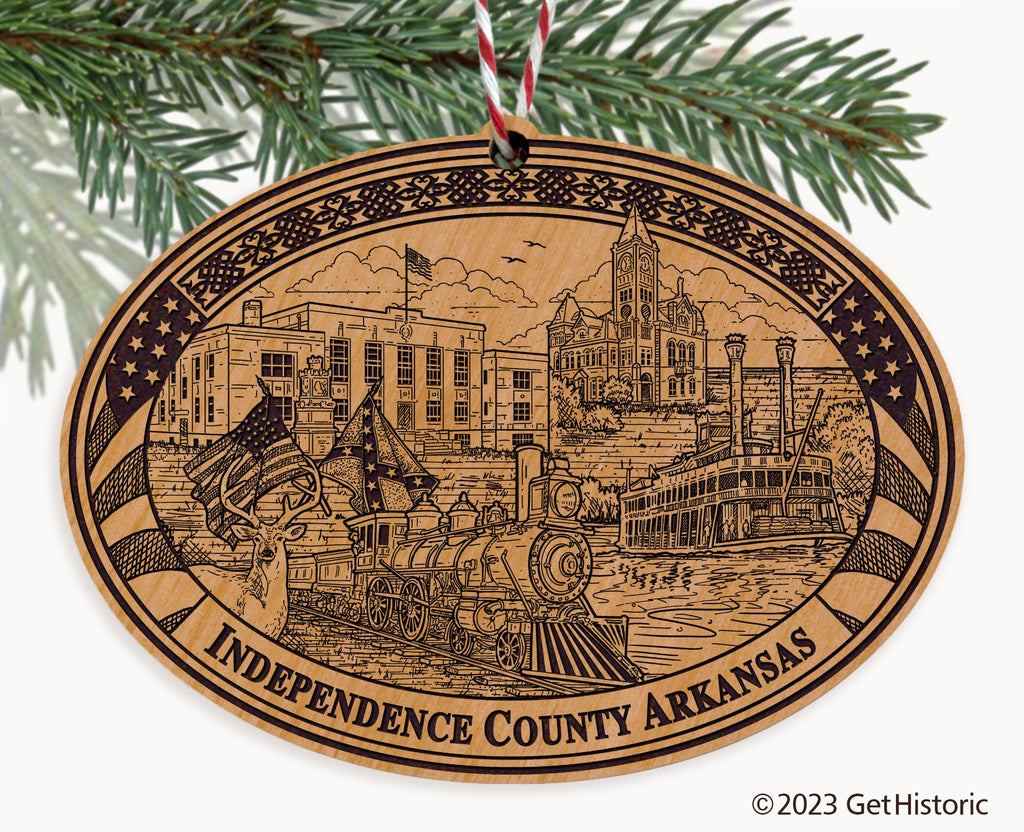 Celebrate the history of Independence County Arkansas with our exclusive Natural Wood Engraved Ornament. One side will feature unique artwork telling the story of your county's history. The other side features a FREE personalization to create a cherished keepsake. If you choose not to personalize, our Get Historic logo and scrollwork will be engraved.