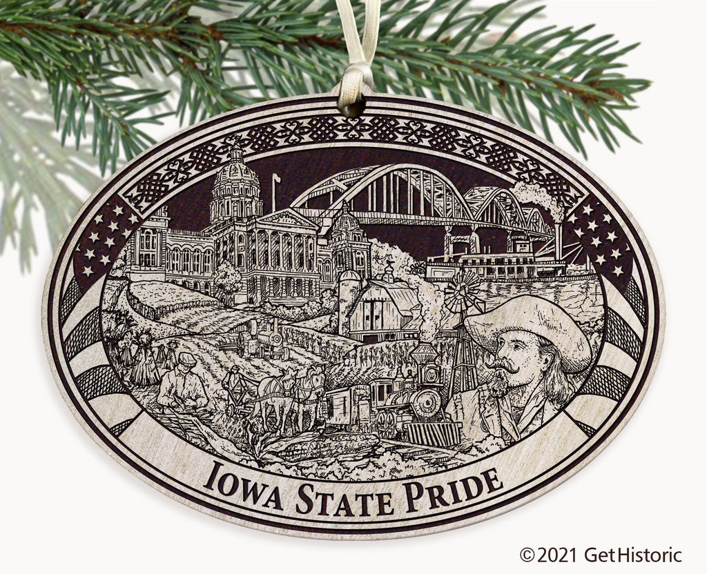 Celebrate the history of Iowa with our exclusive Personalized Wood Engraved Ornament. One side will feature unique artwork telling the story of your state's history. The other side will be personalized with your own wording to create a cherished keepsake. If you choose not to personalize, our Get Historic logo and scrollwork will be engraved.