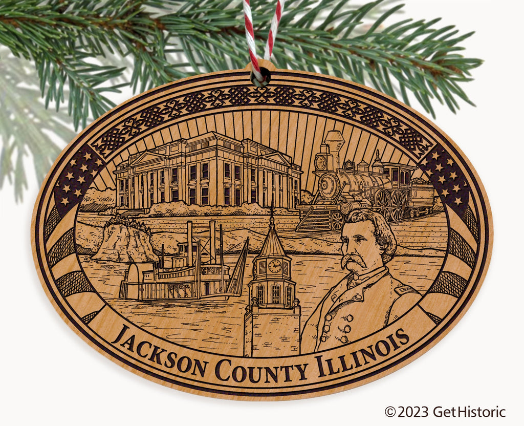 Celebrate the history of Jackson County Illinois with our exclusive Natural Wood Engraved Ornament. One side will feature unique artwork telling the story of your county's history. The other side features a FREE personalization to create a cherished keepsake. If you choose not to personalize, our Get Historic logo and scrollwork will be engraved.