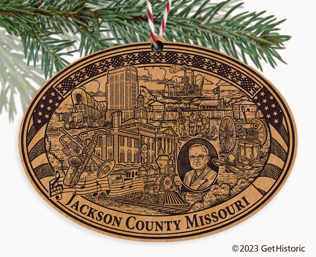 Celebrate the history of Jackson County Missouri with our exclusive Natural Wood Engraved Ornament. One side will feature unique artwork telling the story of your county's history. The other side features a FREE personalization to create a cherished keepsake. If you choose not to personalize, our Get Historic logo and scrollwork will be engraved.