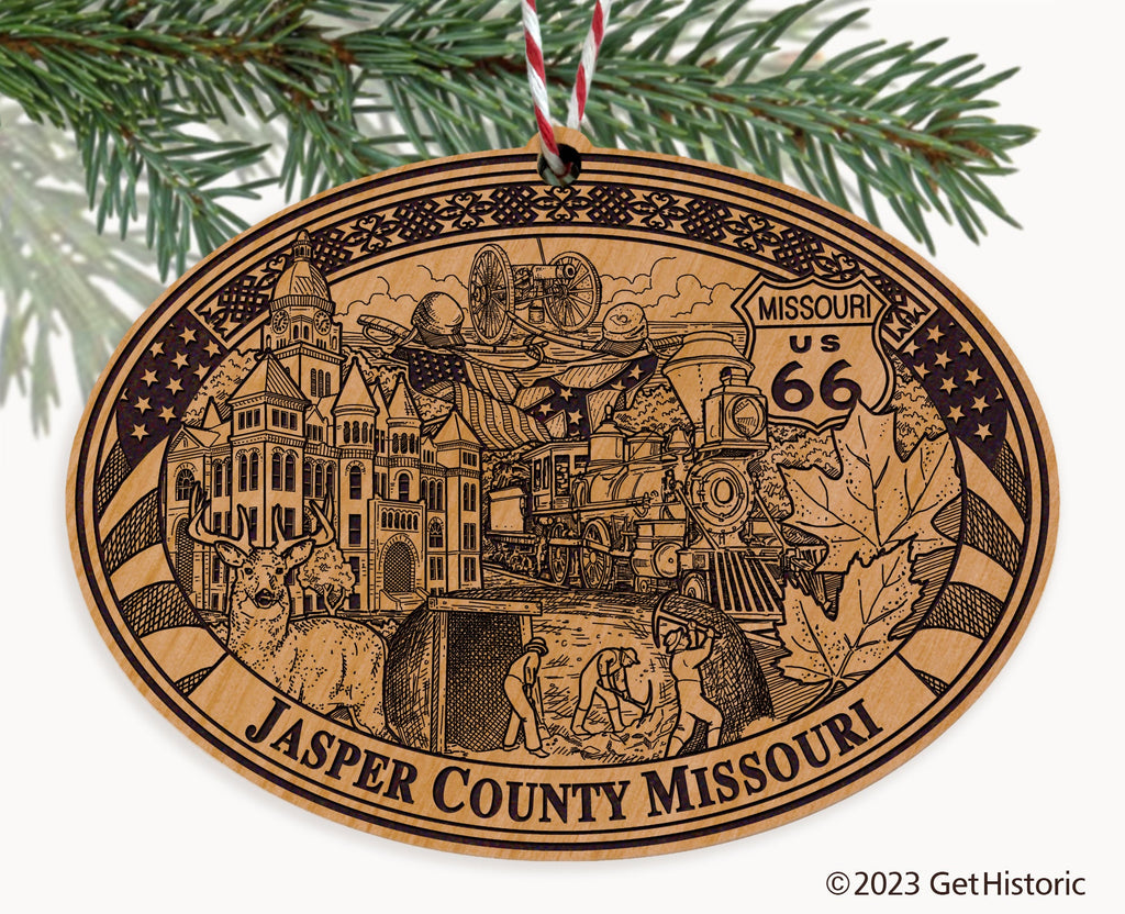 Celebrate the history of Jasper County Missouri with our exclusive Natural Wood Engraved Ornament. One side will feature unique artwork telling the story of your county's history. The other side features a FREE personalization to create a cherished keepsake. If you choose not to personalize, our Get Historic logo and scrollwork will be engraved.