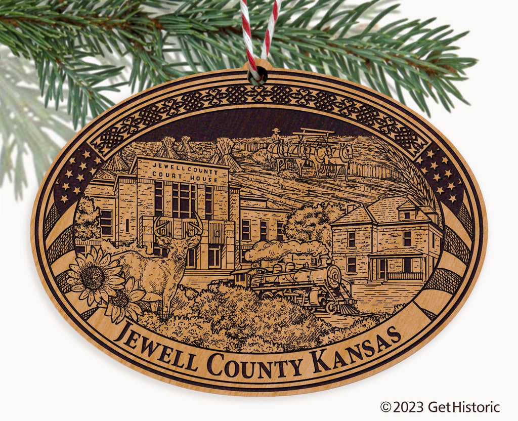 Celebrate the history of Jewell County with our exclusive Natural Wood Engraved Ornament. One side will feature unique artwork telling the story of your county's history. The other side features a FREE personalization to create a cherished keepsake. If you choose not to personalize, our Get Historic logo and scrollwork will be engraved.