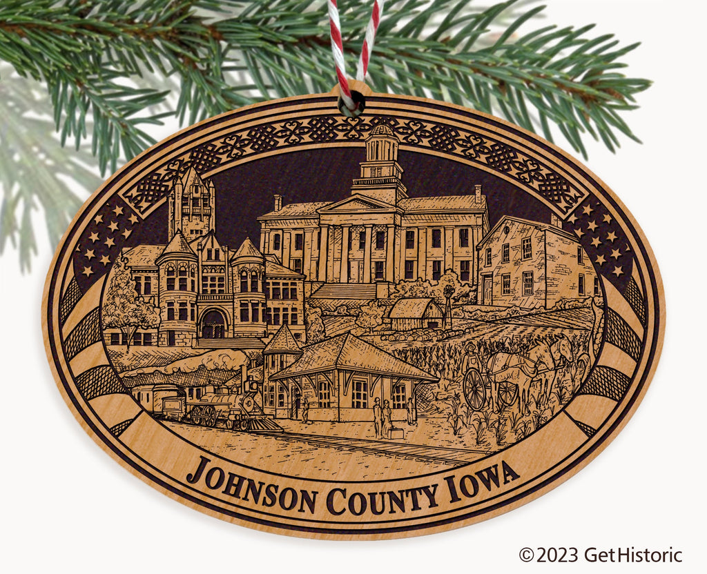 Celebrate the history of Johnson County with our exclusive Natural Wood Engraved Ornament. One side will feature unique artwork telling the story of your county's history. The other side features a FREE personalization to create a cherished keepsake. If you choose not to personalize, our Get Historic logo and scrollwork will be engraved.
