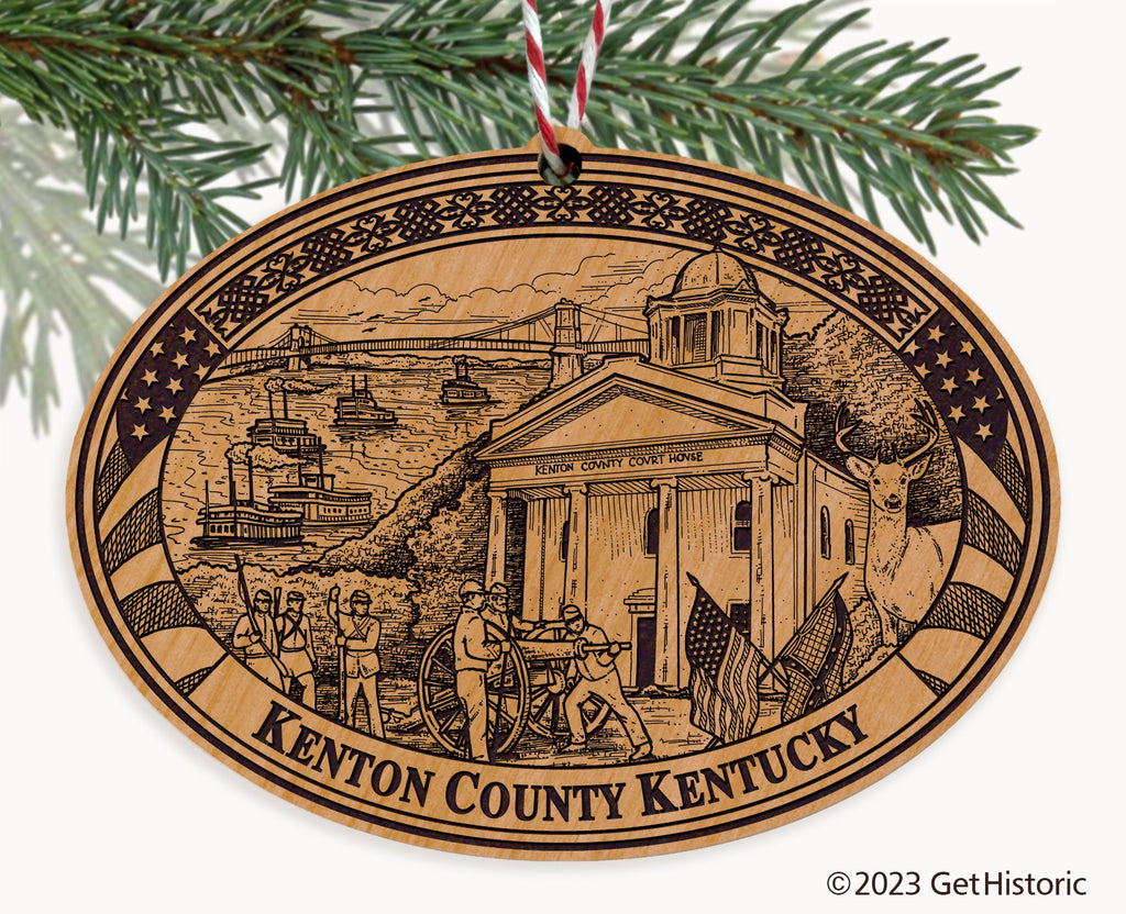 Celebrate the history of Kenton County with our exclusive Natural Wood Engraved Ornament. One side will feature unique artwork telling the story of your county's history. The other side features a FREE personalization to create a cherished keepsake. If you choose not to personalize, our Get Historic logo and scrollwork will be engraved.