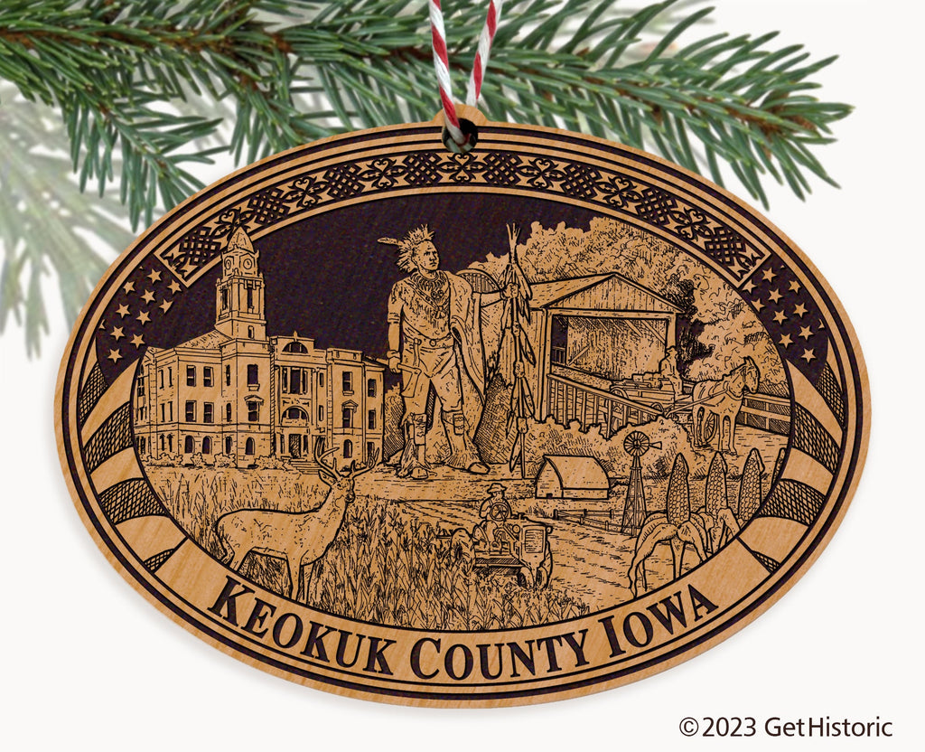 Celebrate the history of Keokuk County with our exclusive Natural Wood Engraved Ornament. One side will feature unique artwork telling the story of your county's history. The other side features a FREE personalization to create a cherished keepsake. If you choose not to personalize, our Get Historic logo and scrollwork will be engraved.