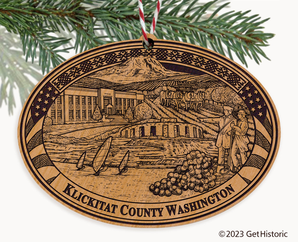Celebrate the history of Klickitat County with our exclusive Natural Wood Engraved Ornament. One side will feature unique artwork telling the story of your county's history. The other side features a FREE personalization to create a cherished keepsake. If you choose not to personalize, our Get Historic logo and scrollwork will be engraved.