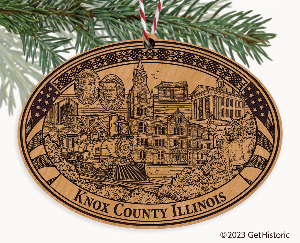 Celebrate the history of Knox County Illinois with our exclusive Natural Wood Engraved Ornament. One side will feature unique artwork telling the story of your county's history. The other side features a FREE personalization to create a cherished keepsake. If you choose not to personalize, our Get Historic logo and scrollwork will be engraved.