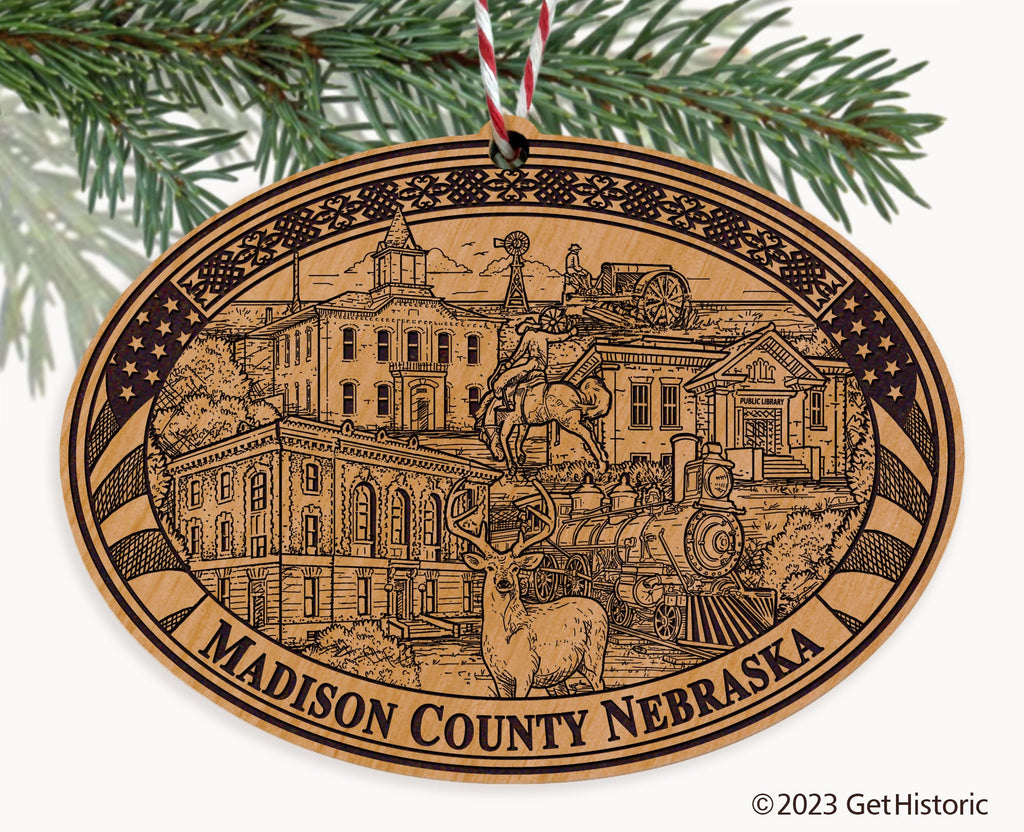 Celebrate the history of Madison County with our exclusive Natural Wood Engraved Ornament. One side will feature unique artwork telling the story of your county's history. The other side features a FREE personalization to create a cherished keepsake. If you choose not to personalize, our Get Historic logo and scrollwork will be engraved.