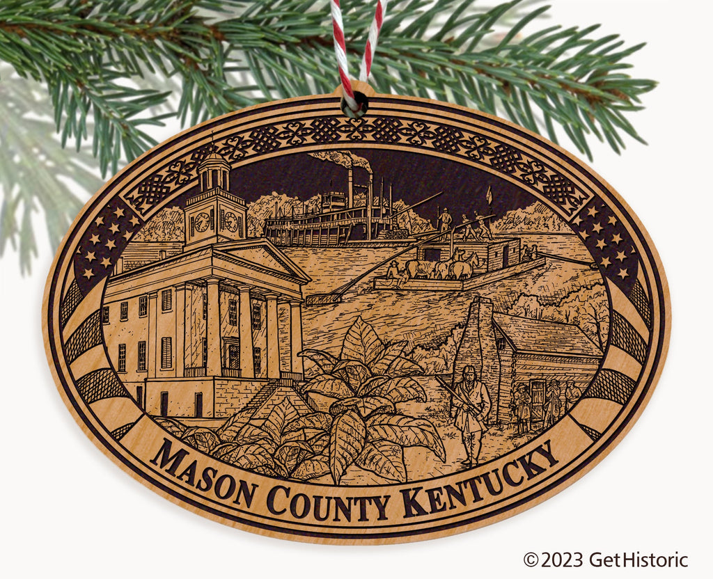 Celebrate the history of Mason County with our exclusive Natural Wood Engraved Ornament. One side will feature unique artwork telling the story of your county's history. The other side features a FREE personalization to create a cherished keepsake. If you choose not to personalize, our Get Historic logo and scrollwork will be engraved.
