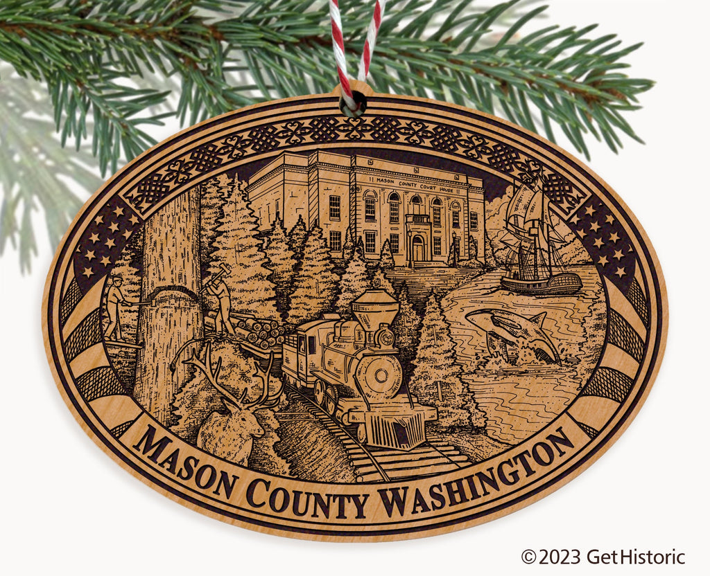 Celebrate the history of Mason County with our exclusive Natural Wood Engraved Ornament. One side will feature unique artwork telling the story of your county's history. The other side features a FREE personalization to create a cherished keepsake. If you choose not to personalize, our Get Historic logo and scrollwork will be engraved.