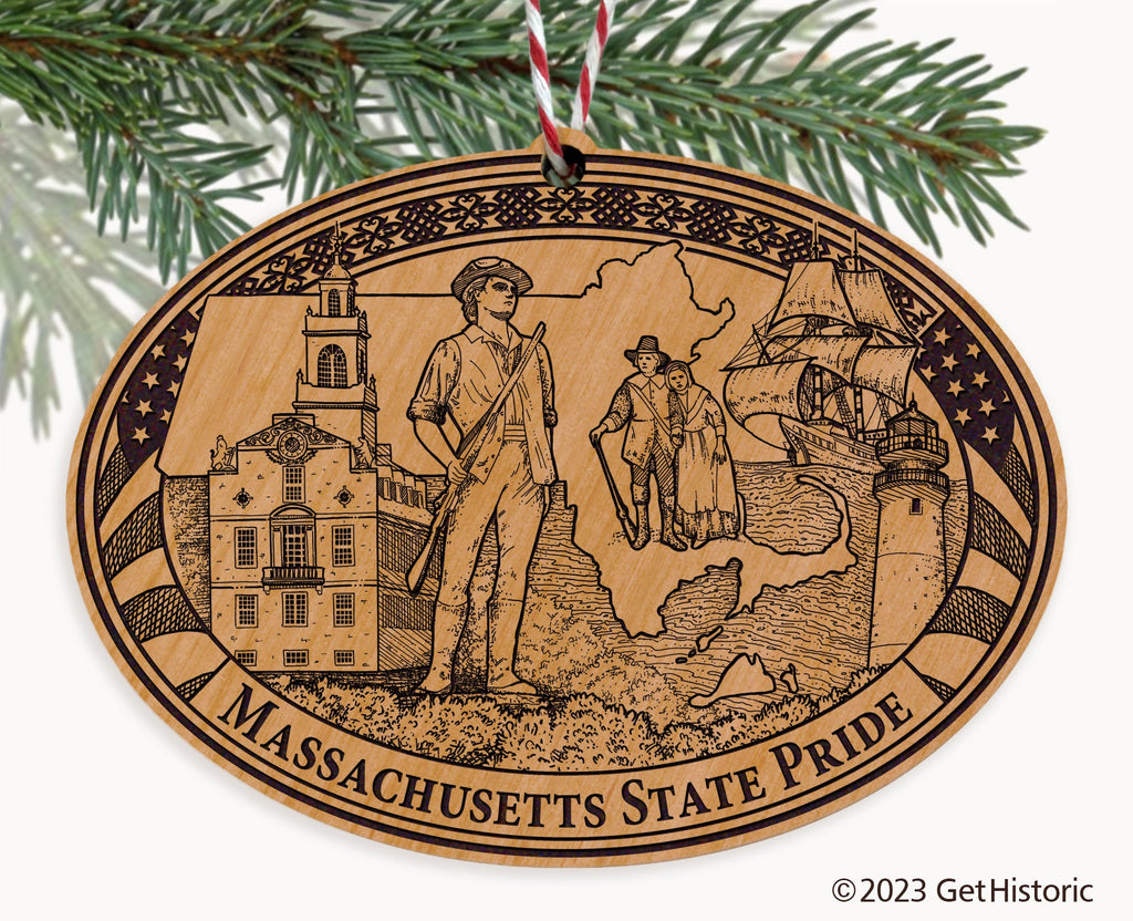 Celebrate the history of Massachusetts with our exclusive Natural Wood Engraved Ornament. One side will feature unique artwork telling the story of your county's history. The other side features a FREE personalization to create a cherished keepsake. If you choose not to personalize, our Get Historic logo and scrollwork will be engraved.